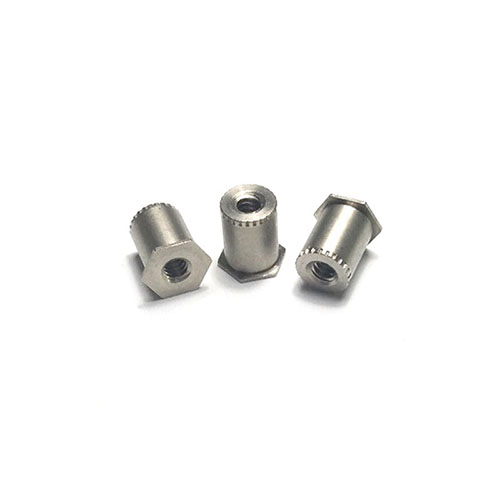 壓鉚螺母柱又稱壓鉚螺柱或螺母柱,是應(yīng)用于鈑金、薄板、機箱、機柜的一種緊固件,壓鉚螺母柱其外形一端呈六角形,另一端為圓柱狀,六角邊與圓柱狀中間有一道退刀槽,其內(nèi)形為內(nèi)螺紋,通過壓力機將六角頭壓入薄板的預(yù)置孔內(nèi)(預(yù)置孔的孔徑一般略大于壓鉚螺柱的圓柱外徑)使孔的周邊產(chǎn)生塑性變形,變形部分被擠入壓鉚螺母柱的退刀槽內(nèi),使壓鉚螺母柱鉚緊于薄板上,從而在薄板上形成一下有效固定的內(nèi)螺紋。