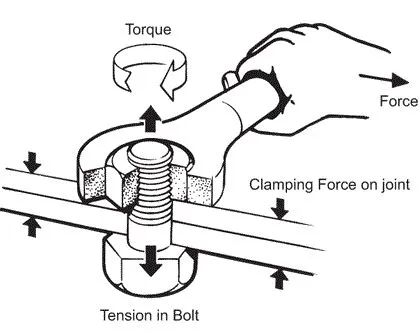 如上圖所示:施加扭矩旋轉(zhuǎn)螺栓后,螺桿受力伸長(zhǎng)了,螺桿伸長(zhǎng)產(chǎn)生夾緊力把連接件夾緊了。我們知道,施加的扭矩并不像夾緊力那么簡(jiǎn)單,在通用公式中:力(F)*力矩(L)=扭矩M